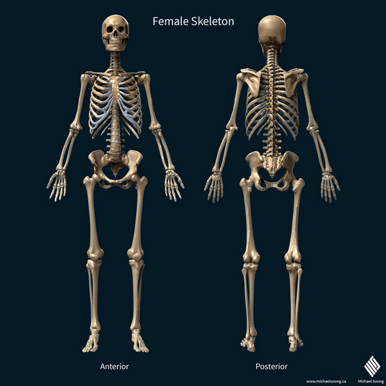 Using CT data to increase accuracy, this 3D model of a female skeleton was sculpted in ZBrush. The skeleton was isolated using 3D Slicer and then exported to ZBrush to use as a starting point. The finished product is not intended to be a precise replica of the original CT data but instead a generalized female skeleton that can be used as a base for other projects.